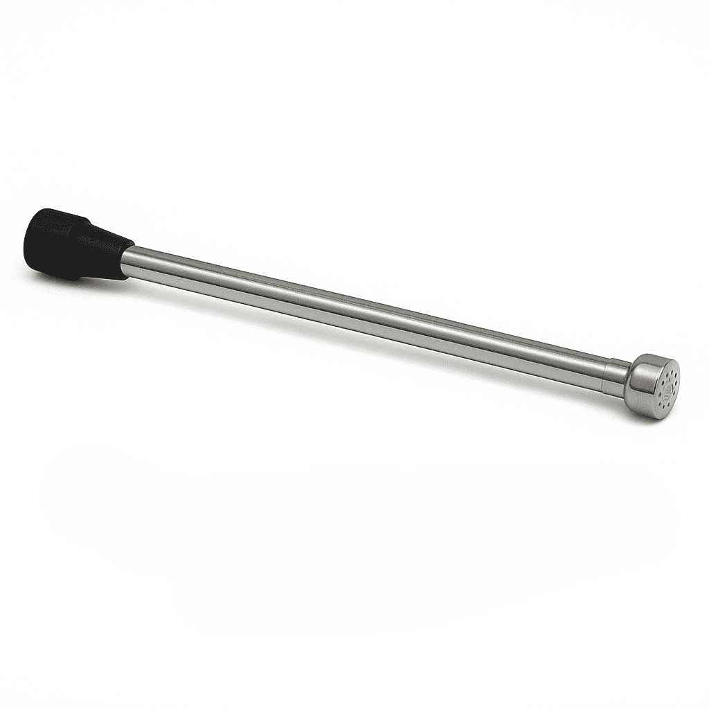 Alargadera cromada perforada D10×47.5 mm. Repuesto resistente para bombas aspersoras. Empaque de 5 unidades. Mejora alcance y durabilidad.