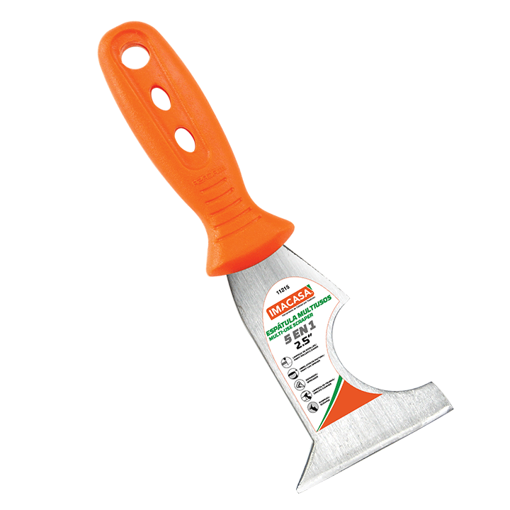 Espátula multiusos 5 en 1 de 2.5″, hoja rígida de acero y mango plástico. Ideal para raspado, limpieza, abrir pintura y aplicar masilla.