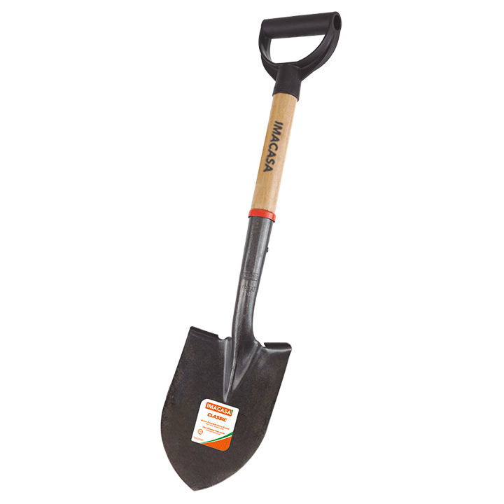 Pala Cajuélera redonda 4×4 clásica con hombros hacia adelante, hoja 6″x8 1/4″ y mango de 26″. Ideal para labores agrícolas y manejo eficiente.